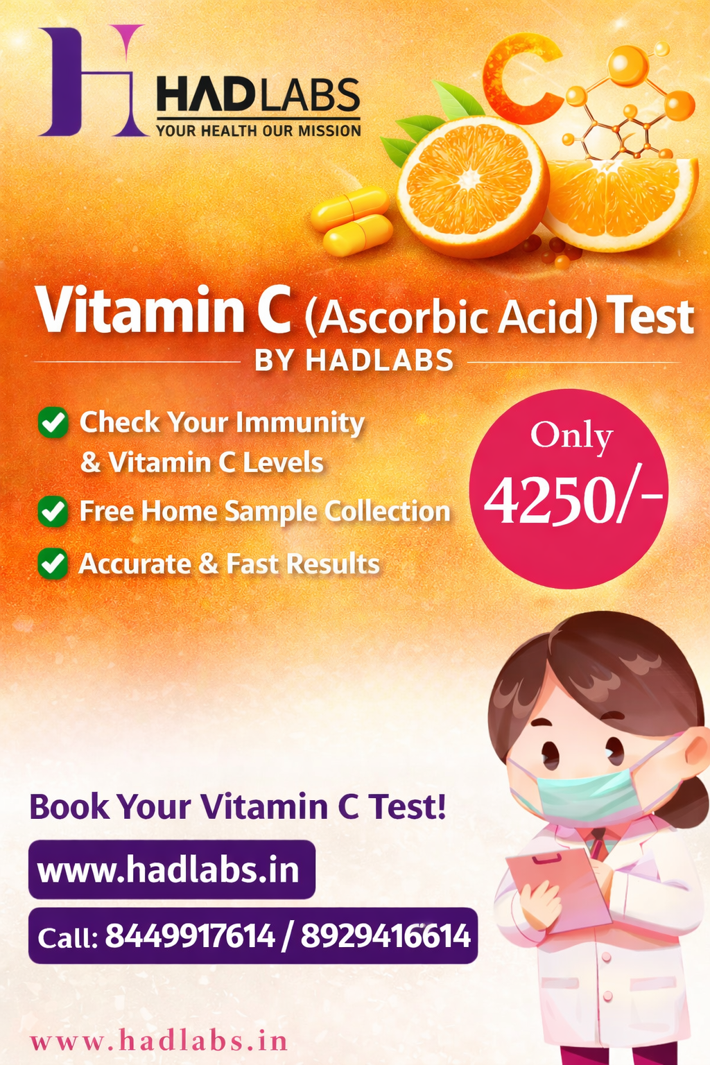 Book Vitamin C (Ascorbic Acid) blood test at HADLABS. Accurate reports, free home sample collection, and quick turnaround. Ideal for immunity & deficiency check.